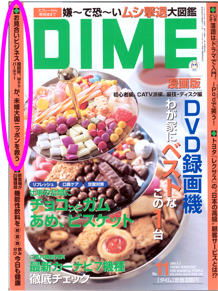 ■ 『小学館』さんが発行する 雑誌 『DIME ダイム』 の初めての取材でした。 小学館DIMEさんか、統計もしっかりとりお見合いビジネスについての将来性を探っていました。 少子高齢化を見据えた企画です。 厚生省も見習ってほしいものです。このままでは手遅れになります。 良質な人口こそ21世紀の資源なのです。